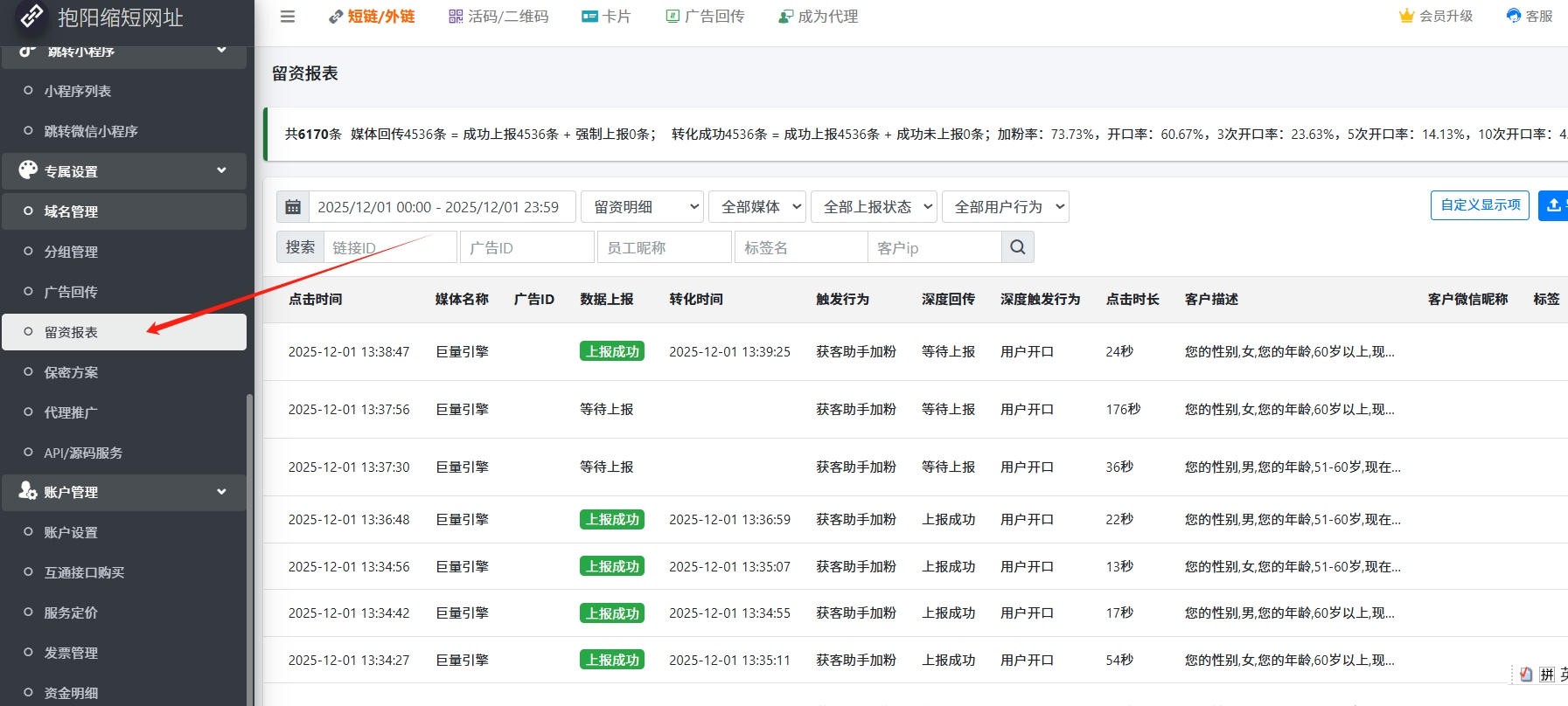 2. 可以通过左侧得【留资明细】,更换为汇总数据形式