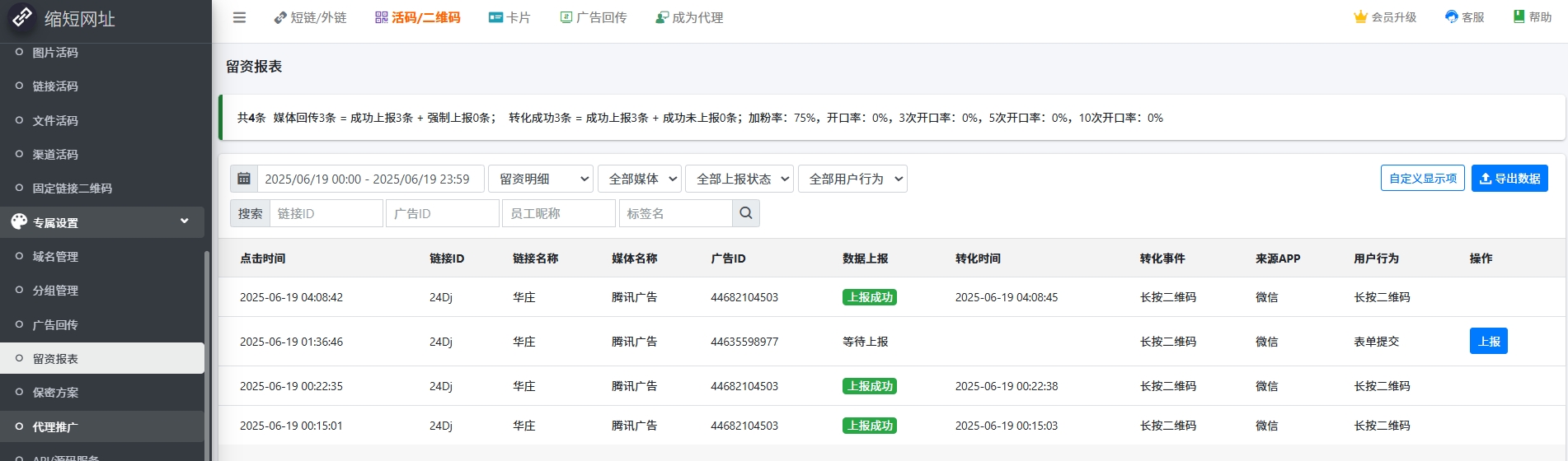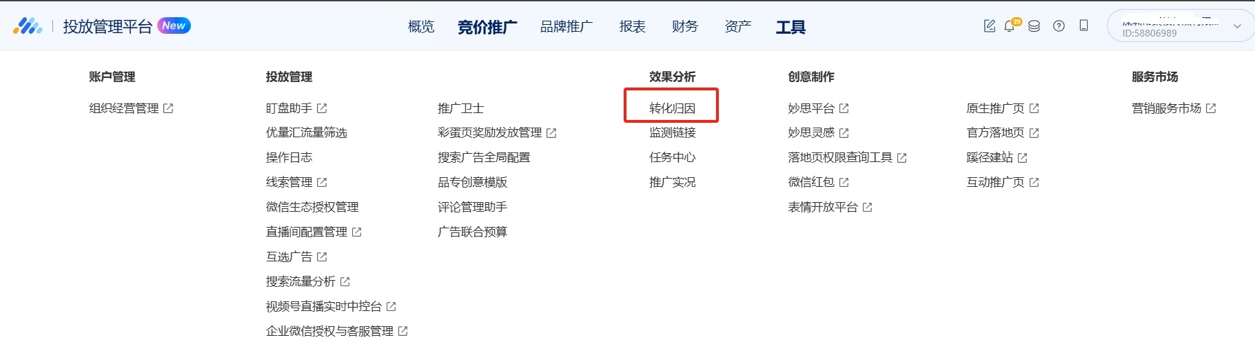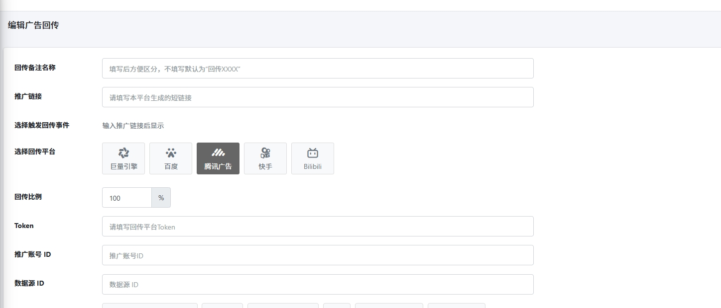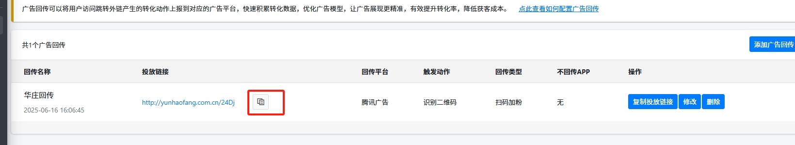 1.到管理后台,选择【广告回传】,新建腾讯的广告回传链接