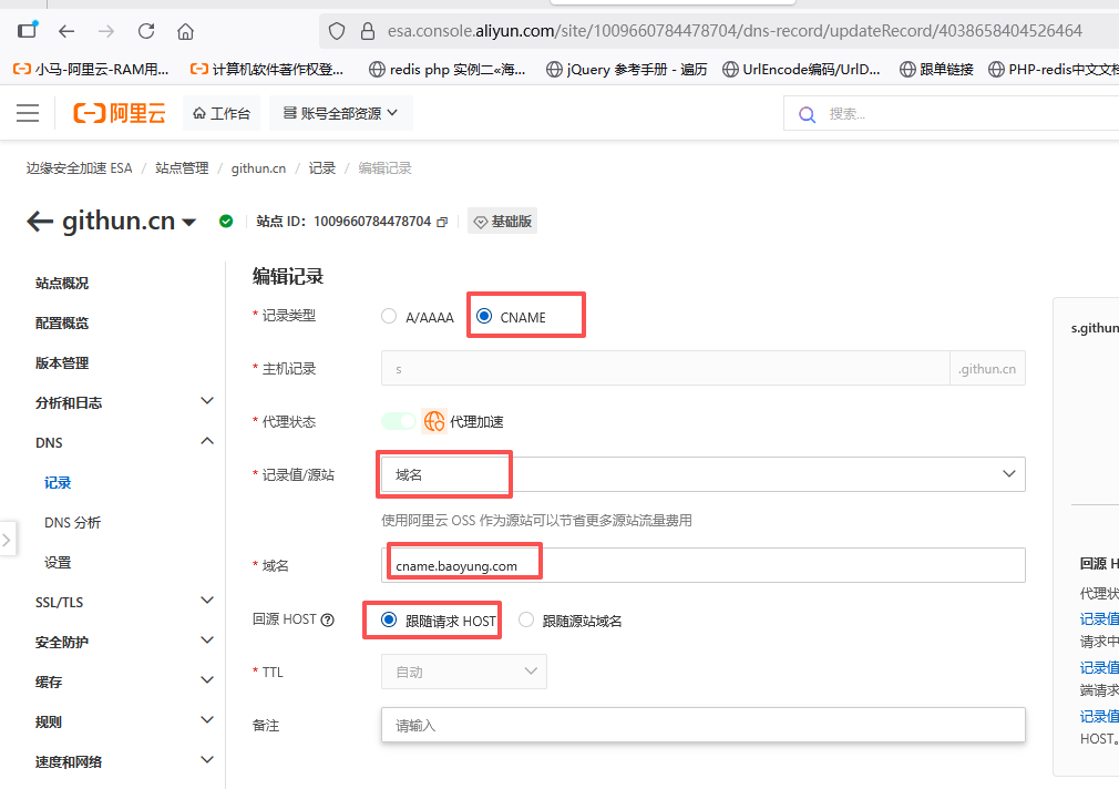 记录类型: CNAME ; 主机记录: 例如想要使用 s.githun.cn 域名,则填入 s ; 记录值/源站: 域名 ; 域名: cname.baoyung.com 回源HOST: 跟随源站域名