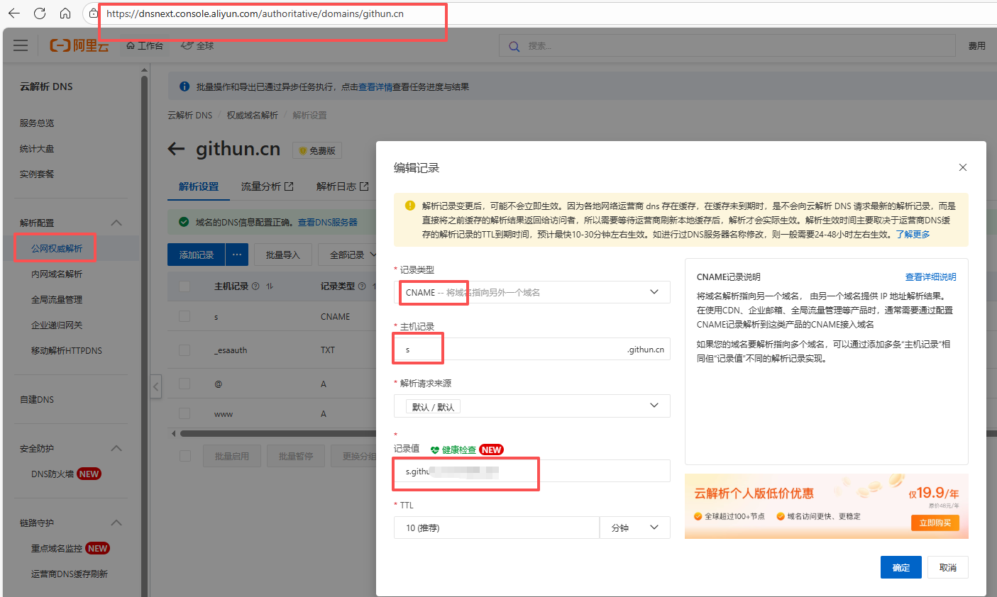 4. 设置s.githun.cn的域名解析,复制下图的值,到域名解析去设置