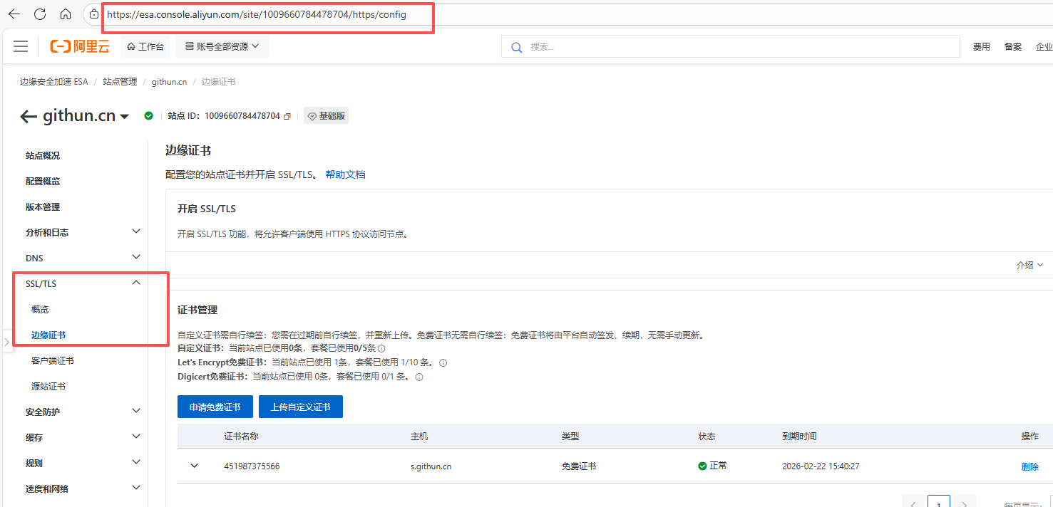 1. 入口:站点管理-找到对应的域名-SSL/TLS-边缘证书