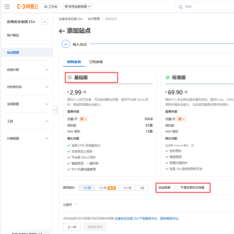 选择套餐:基础版,是否开启自动续费,根据自己需求选择
