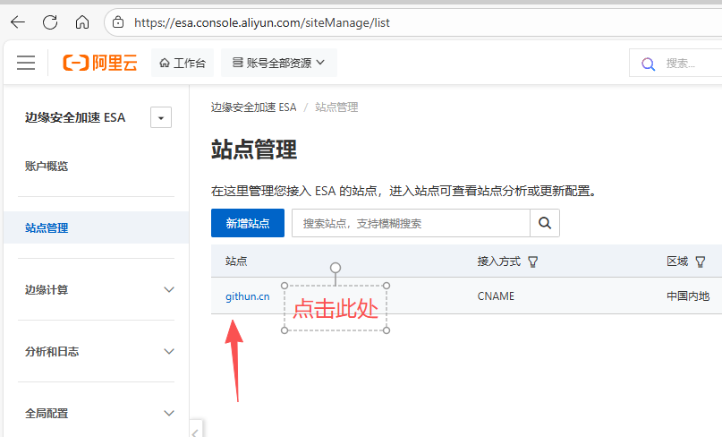 1. 进入"站点管理", https://esa.console.aliyun.com/siteManage/list