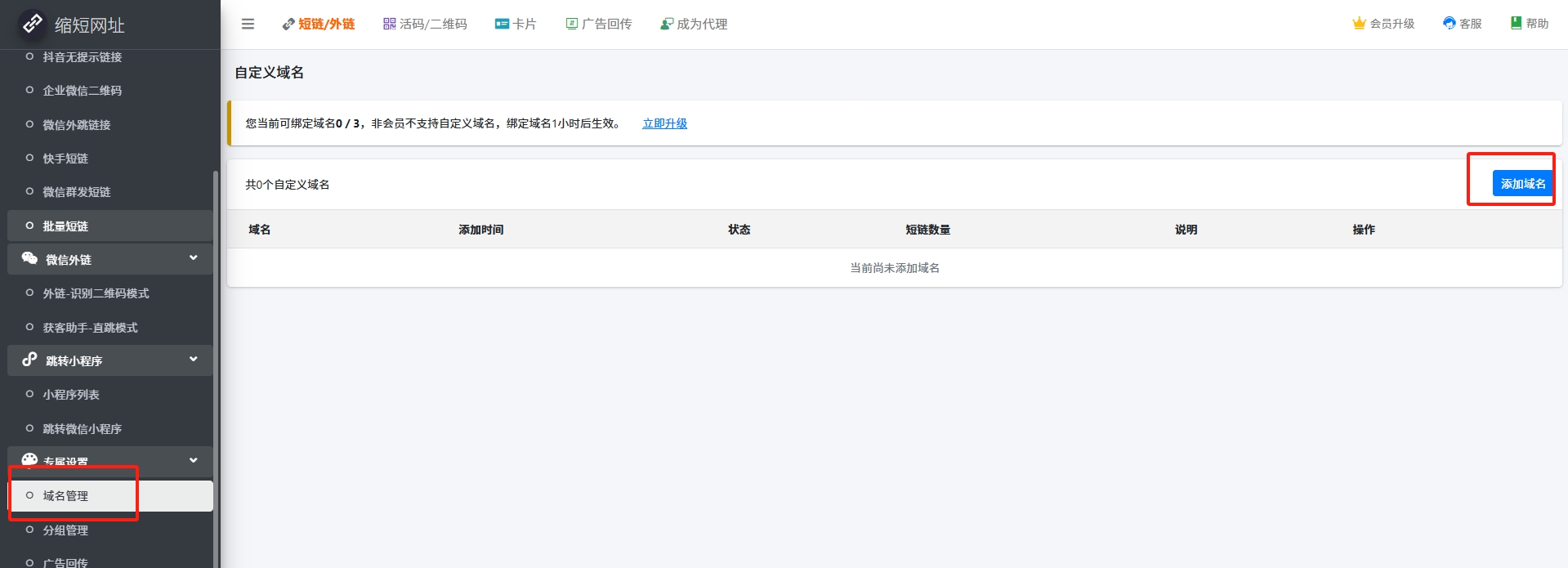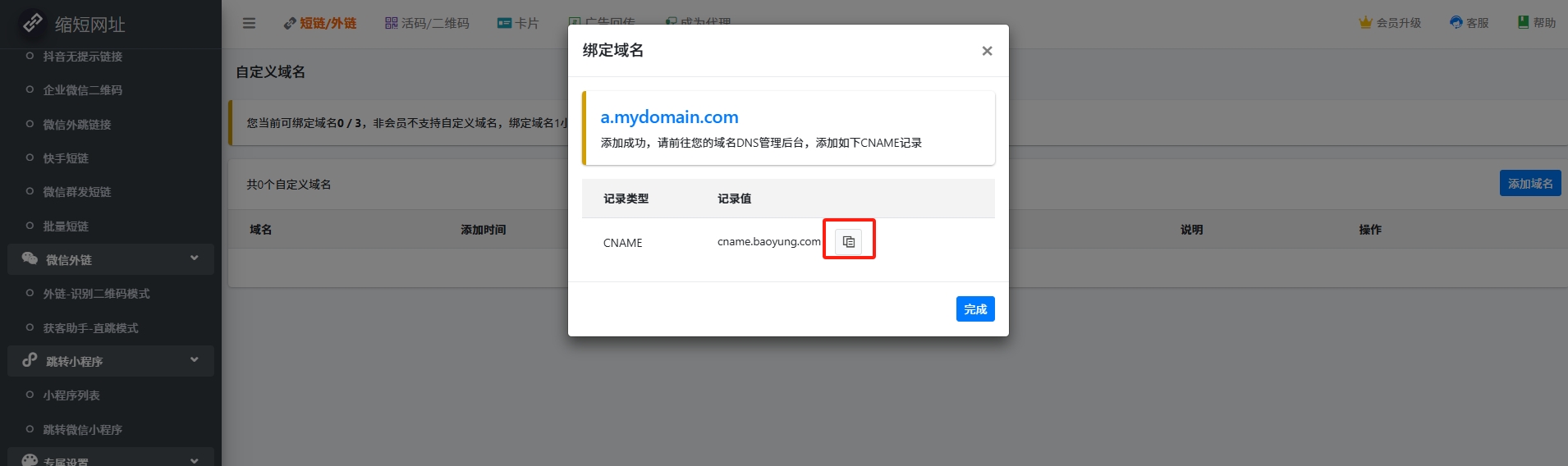 输入你自有的域名(必须为阿里云备案域名),可以为二级子域名,这样可以不影响你原有的业务。例如你的域名为 mydomain.com,可以这里提交一个a.mydomain.com作为短链域名.