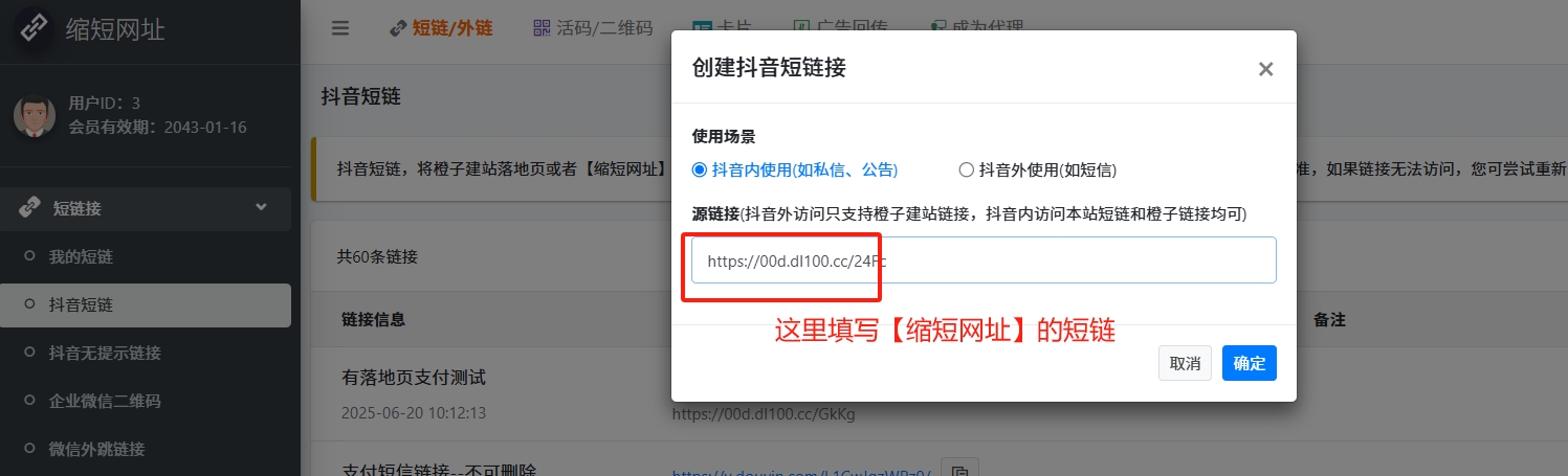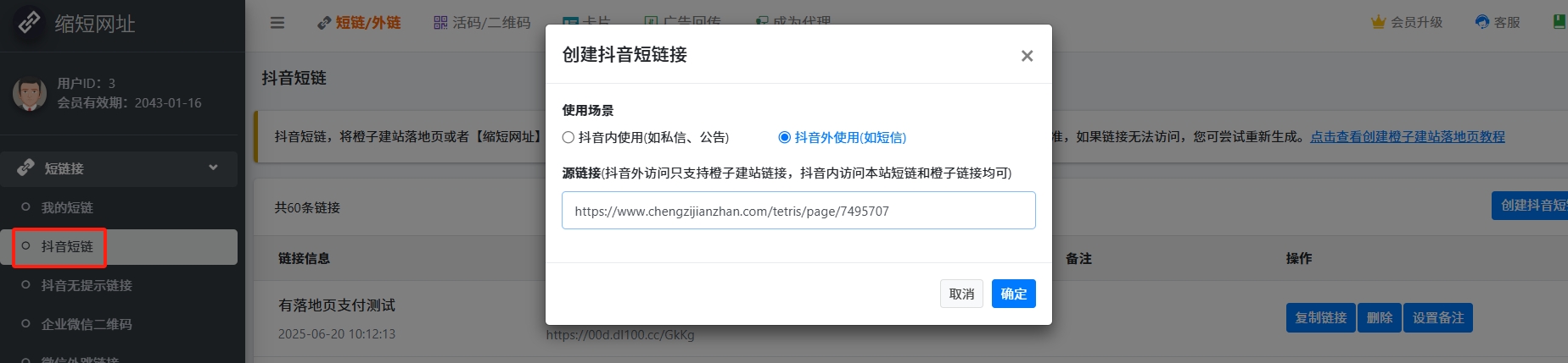 如果是抖音外使用v.douyin.com的短链(如抖店短信),或者如果需要自定义跳转页面,必须设置自己的橙子建站链接