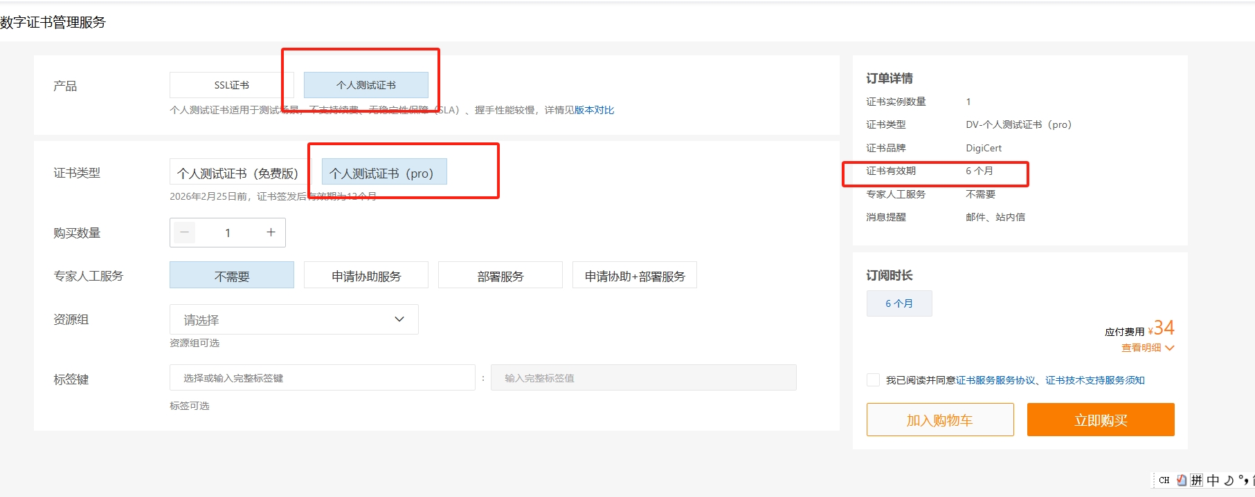 - 选择【个人测试证书pro】,选择6个月有效期,然后下单购买