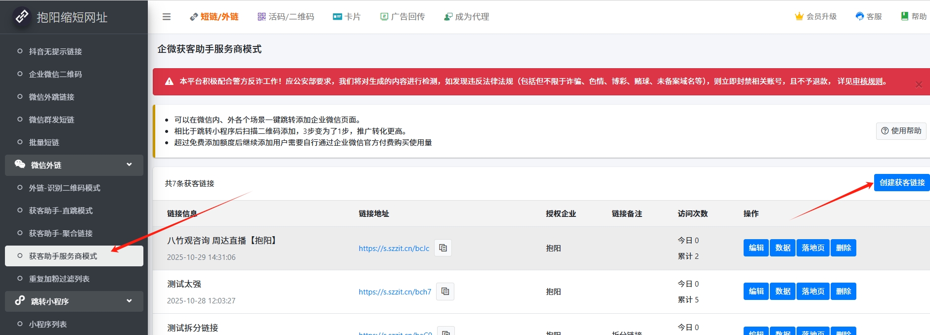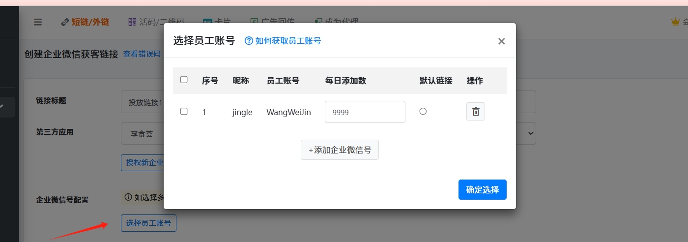 1. 选择获客链接的员工,可以设置每个员工的加粉限额。【默认链接】--表示此员工为兜底员工,全部员工加粉都超过限额后,使用此员工为加粉;每个员工按设置的加粉限额,轮流加粉。